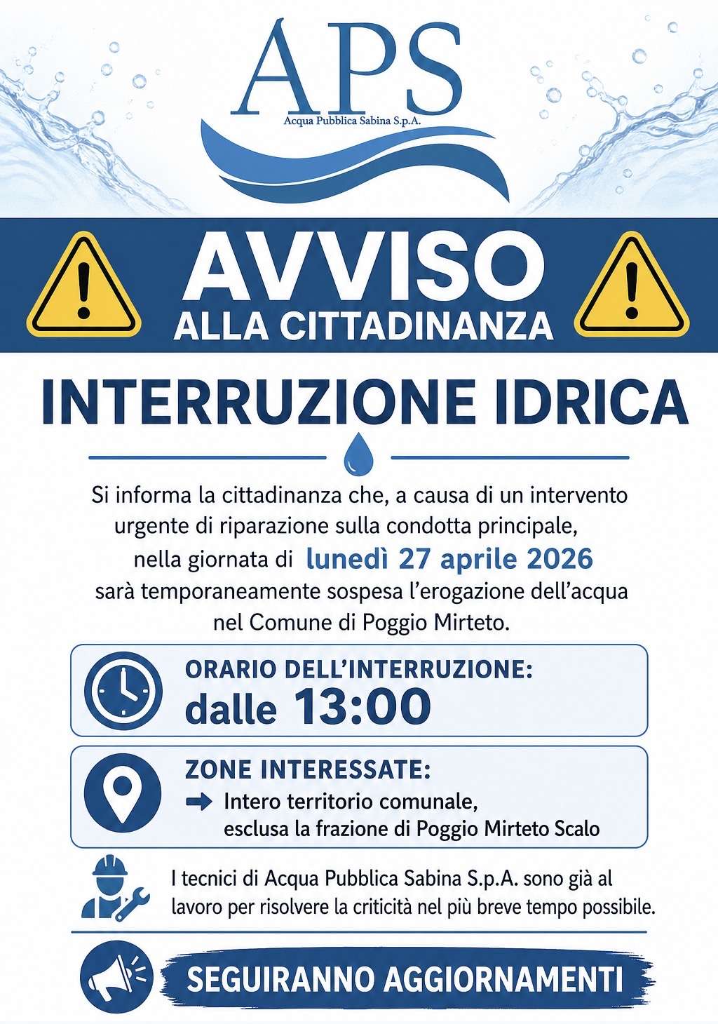 Si informa la cittadinanza che, a causa di un intervento urgente di riparazione sulla condotta principale, nella giornata di lunedì 27 aprile 2026 sarà temporaneamente sospesa l’erogazione dell’acqua nel Comune di Poggio Mirteto.